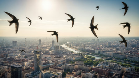 A captivating urban cityscape featuring a flock of birds soaring above high-rise buildings, blending nature with urban architecture for a serene scene.