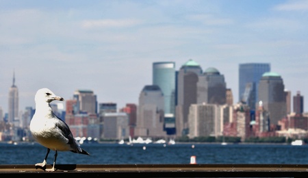 Close up shot of a flying dove in New York city