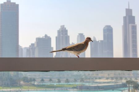 Bird in a city next to skyscraper buildings and towers. Pretty bird sitting on a steel and glass railing looking at contemporary modern city.