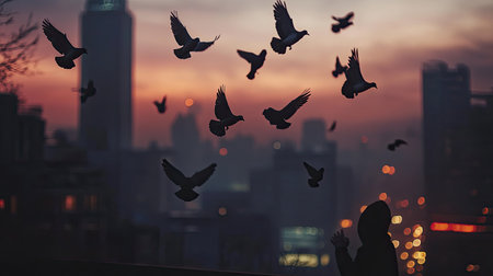Silhouette of pigeons soaring from a rooftop, with a hand and city lights creating a dramatic dusk scene