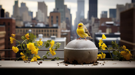 a bird perches on a ledge overlooking a city building, showcasing a unique blend of corporate punk and photo-realistic hyperbole. this captivating image captures the essence of nyc explosion coverage, with a touch of inspiration from cicely mary barker's artwork. the photograph, found on flickr, is a creation by the talented photographer john wilhelm, featuring a striking combination of light gray and red tones. ai