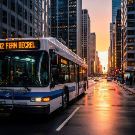 A city bus navigates a wet, urban street scene at sunset. The vehicle is the primary subject, with tall buildings lining the roadway. The sky displays warm hues reflecting across the wet pavement. This image could be utilized for various commercial and editorial purposes.