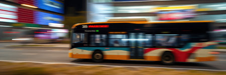 City bus in motion at night near urban buildings with bright advertisements and lively atmosphere