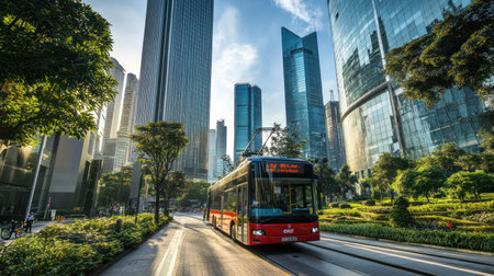 A public transit bus running on clean energy, driving through a busy urban area.