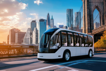 A sleek electric bus travels through a bustling city with towering skyscrapers under a vibrant sunset.