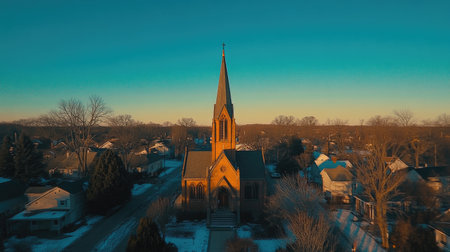 Aerial view of a historic church at sunset, surrounded by a peaceful winter landscape. The warm glow highlights the architecture and serene setting.