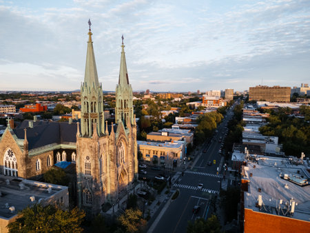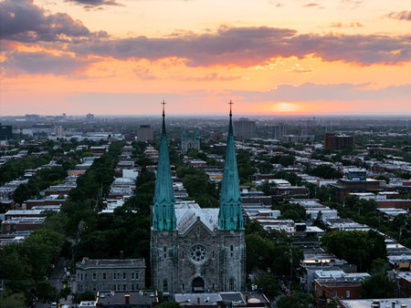 Drone flight above the Roman Catholic Saint-Edouard Church in Montreal at sunset, Quebec, Canada