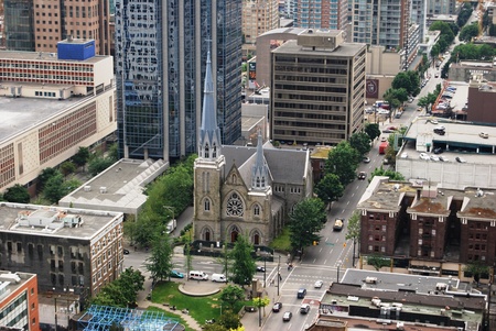 An aerial photograph showcasing a historic cathedral with spires nestled amidst modern skyscrapers, creating a striking contrast in an urban environment.