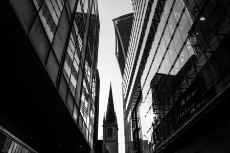 A low-angle view of an old church with a green spire, juxtaposed against a modern building under construction with scaffolding.