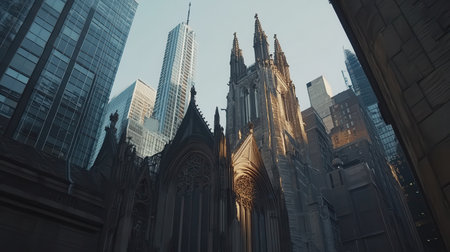 A majestic cathedral stands tall amidst towering skyscrapers, showing intricate gothic architecture. The play of light highlights the details against the urban backdrop.