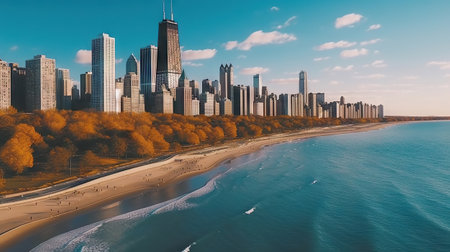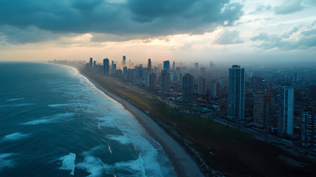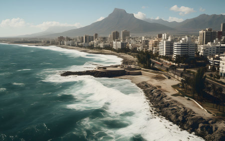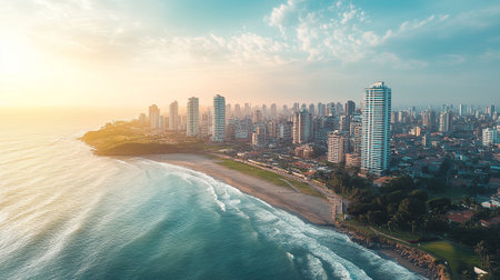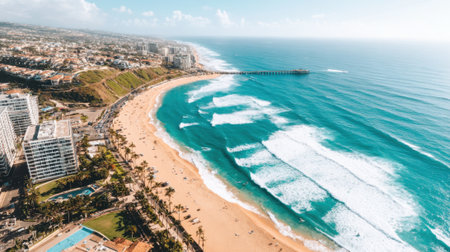 A breathtaking high angle perspective of a modern coastal city where urban life meets the powerful, rolling waves of the turquoise sea on a sunny day.