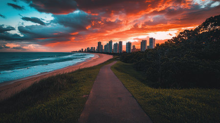 Picturesque view of a coastal city skyline at sunset. A pathway winds through the grassy area leading to the shoreline and towards the city buildings, offering a beautiful combination of urban and natural elements. The sunset colors paint a dramatic scene across the sky.