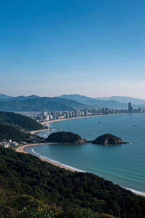 Panoramic view of coastal cities and mountains and seas