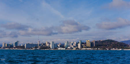 SOCHI, RUSSIA January, 2016: View of the beach in the Sochi, Russia. Cityscape of Sochi and river