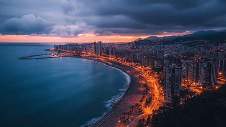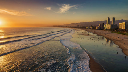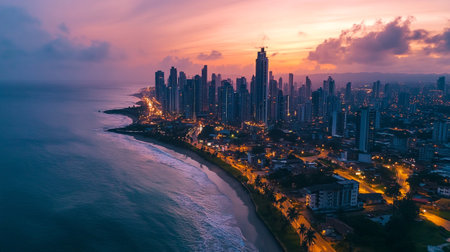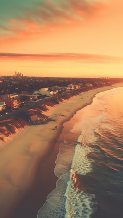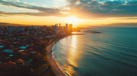Aerial view of a beach and city skyline at sunset