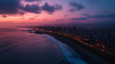 A breathtaking aerial perspective of ocean waves meeting the shore of a seaside city during a vibrant pink and purple sunset, capturing a serene coastal landscape.