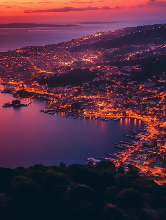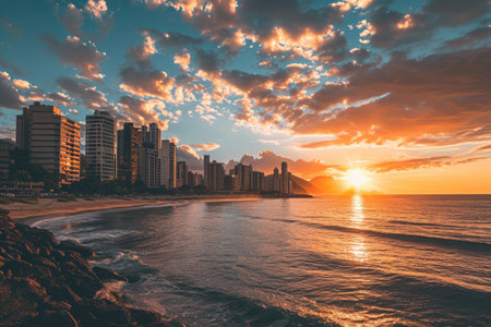 Stunning sunset over a coastal city. Orange and red hues paint the sky.