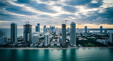 Aerial view of Miami Beach skyline at sunset, Florida, USA.