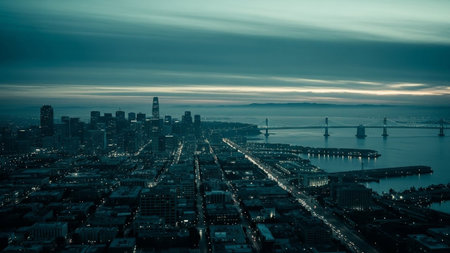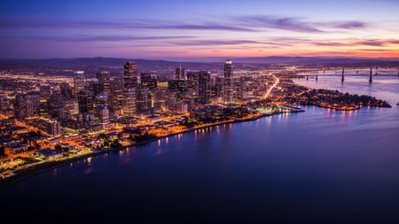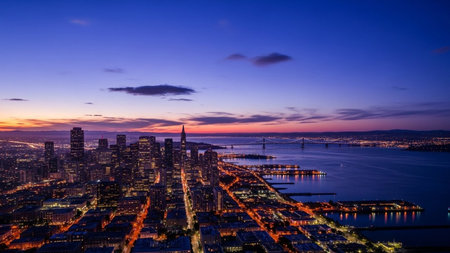 An awe-inspiring aerial view captures the San Francisco cityscape as twilight descends. The city's numerous skyscrapers and buildings are brilliantly illuminated, casting a warm glow that reflects on the dark, vast waters of the bay. The sky is a canvas of vibrant purples, pinks, and oranges, transitioning into deep blues as night approaches. Bridges are visible in the distance, adding to the impressive urban panorama. conveys the energy and beauty of a major metropolitan area at the magical...