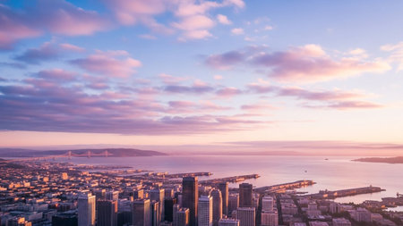 A panoramic aerial view of the San Francisco cityscape bathed in the warm, soft light of sunset. The city's iconic skyline, with its numerous skyscrapers, stretches along the waterfront. The vast expanse of the bay shimmers, reflecting the colorful sky painted with hues of pink, orange, and purple. Several bridges, including the prominent Bay Bridge, connect the city to the surrounding areas. The overall scene is serene and showcasing the beauty of the urban landscape at dusk.