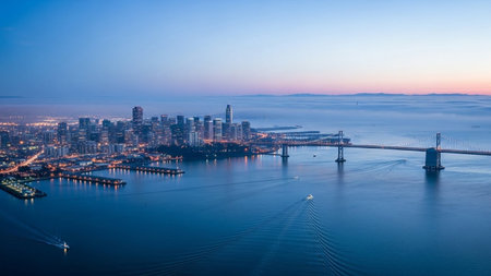 An expansive aerial view of the San Francisco skyline and the Bay Bridge at dusk. The city lights begin to twinkle as the sky transitions through shades of blue and orange. A gentle layer of fog rolls in from the ocean, partially obscuring the distant hills and adding a serene, atmospheric to the scene. Several boats are visible on the water, leaving subtle wakes. captures the iconic beauty and tranquil ambiance of the city by the bay.