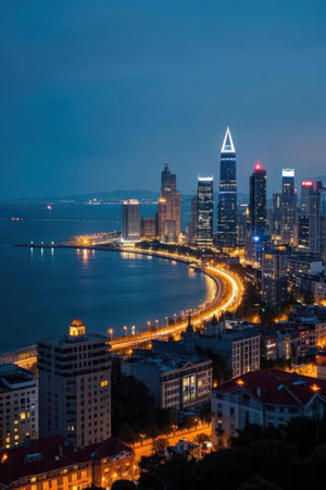 City night view skyline and coastline scenery