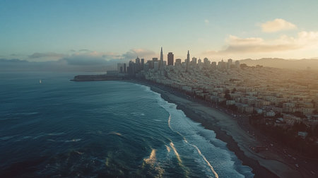 An expansive aerial view of the San Francisco cityscape and its surrounding bay. The captures the sprawling urban landscape with its dense collection of modern skyscrapers and buildings in the downtown area. The vast expanse of the bay is visible, dotted with iconic bridges like the Golden Gate Bridge and the Bay Bridge. The coastline stretches out, showcasing the city's integration with its natural environment. The sky is bright with scattered clouds, offering a clear and detailed...