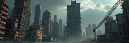 Captivating view of an abandoned construction site flanked by contemporary high-rise buildings, set against a dramatic and moody sky, reflecting urban change.