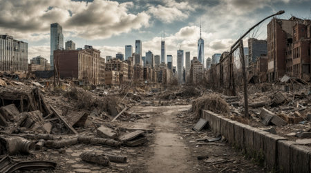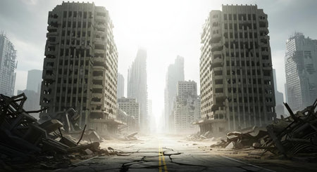 AI Generated. Devastated urban cityscape covered in dust and rubble after a massive destruction event