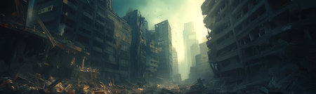 Ruined city skyline with collapsed buildings somber atmosphere dusk lighting wide-angle shot urban disaster scene
