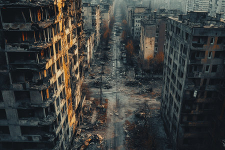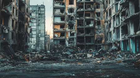 This image captures the haunting remnants of a deserted urban landscape, showcasing crumbling buildings and debris that evoke a sense of abandonment and decay.