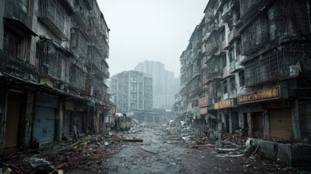 Abandoned Urban Landscape with Derelict Buildings, Trash, and Gloomy Atmosphere in a Post-Apocalyptic Setting