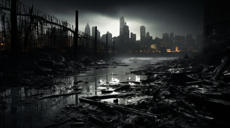 Explore a desolate landscape of decay and shadows in this dystopian illustration, created using Generative AI.
