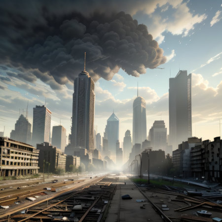 Post-apocalyptic cityscape depicting urban ruins and desolation amidst human exodus.