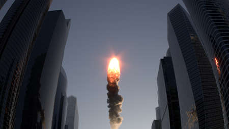 Empty street of burnt up city, flames on the ground and blasts with smoke in the distance. Apocalyptic view of city downtown as disaster film poster concept. Night scene. City destroyed by war.