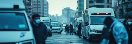Ambulances line up outside hospitals as healthcare workers manage the influx of patients during a critical health emergency.