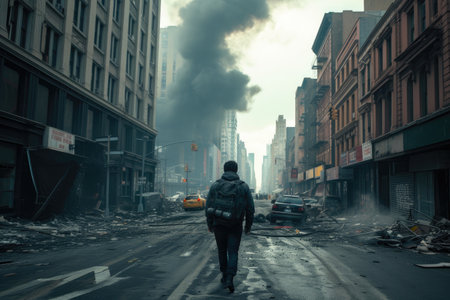 AI Generated. Ruined cityscape with fires raging under a gloomy sky