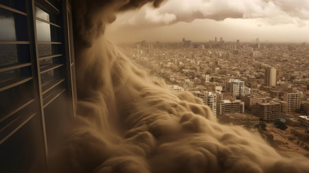 A colossal dust storm looms over a sprawling city, engulfing the skyline with thick clouds of dust and creating an apocalyptic scene, as sunlight struggles to penetrate the dense atmosphere. AI generated image