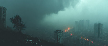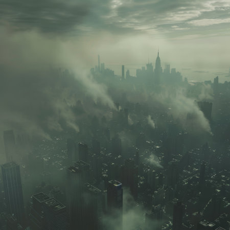 Air Quality Crisis. City Enveloped in Smog and Pollution. Air Pollution Problem in Urban Areas