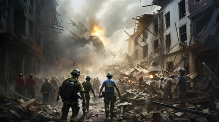 The rescue team is working at the site of the man-made disaster. Destruction after a terrorist attack. Generative AI