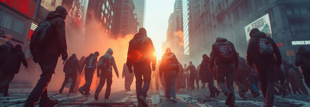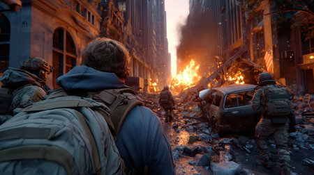 Amidst the debris and flames, a group of individuals in tactical gear navigates through the devastated streets of a city. The daylight fades, casting an eerie glow.