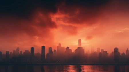 A breathtaking view of a dramatic sunset illuminating an urban skyline, showcasing vibrant shades of red and orange amidst dark clouds.