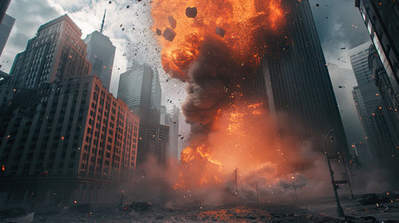 Massive fiery explosion between tall skyscrapers in city, with smoke and flying debris.