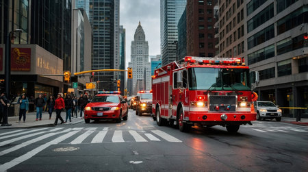 A fire truck races through a busy city street, sirens blaring, as pedestrians cross. Skyscrapers tower above, creating a dramatic urban scene.