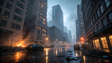 Massive explosion: city skyline engulfed in flames and smoke. Generated by AI
