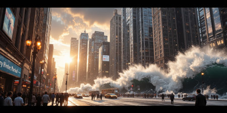 Flood, Cityscape, New York: Tsunami inundates Manhattan streets during sunset, depicting catastrophic flooding.