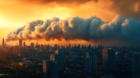 A breathtaking view of a city skyline under a dramatic sunset, featuring thick smoke billowing into the sky, capturing the essence of urban atmosphere and environmental impact.