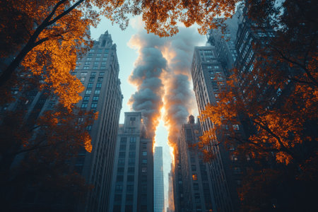 Thick smoke billows upwards between tall buildings as autumn leaves create a colorful contrast.