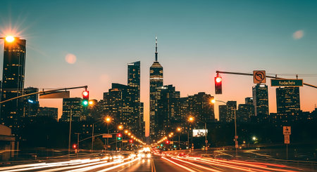 A bustling cityscape at dusk with traffic lights and skyscrapers