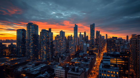 Experience the breathtaking twilight perspective of a bustling metropolitan area showcasing sleek skyscrapers and illuminated streets, reflecting urban vibrancy.